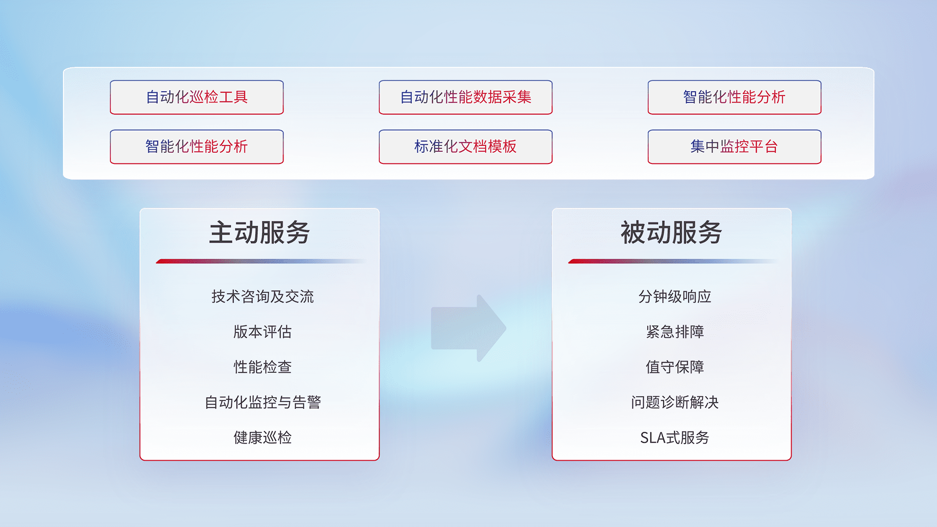智能化工具和标准化文档,,,,保障服务质量,,提供主动服务(包含技术咨询、、、版本评估、、、性能检查、、、、自动化监控与告警、、、健康巡检)和被动服务包含(分钟级响应、、、紧急排障、、值守保障、、问题诊断解决、、、SLA服务)。。